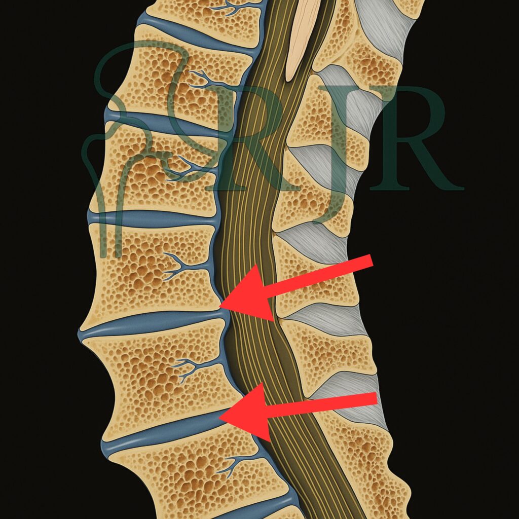 Discos Intervertebrais: O desgaste do disco (discopatia degenerativa) faz com que ele perca altura e capacidade de amortecimento, aumentando a carga sobre as articulações facetárias e reduzindo o espaço para a saída dos nervos.