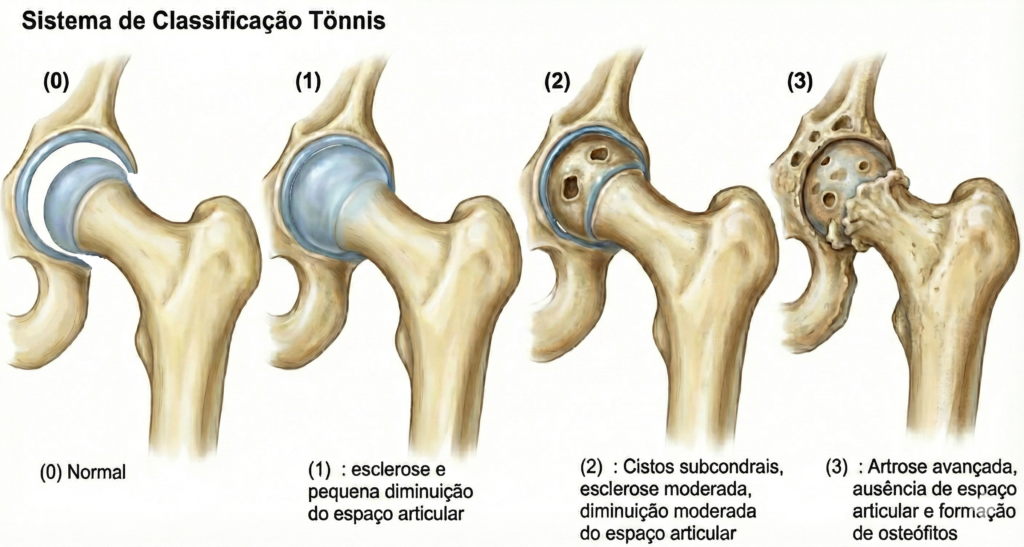 Essas condições alteram a biomecânica do quadril e favorecem o desgaste da cartilagem ao longo do tempo.