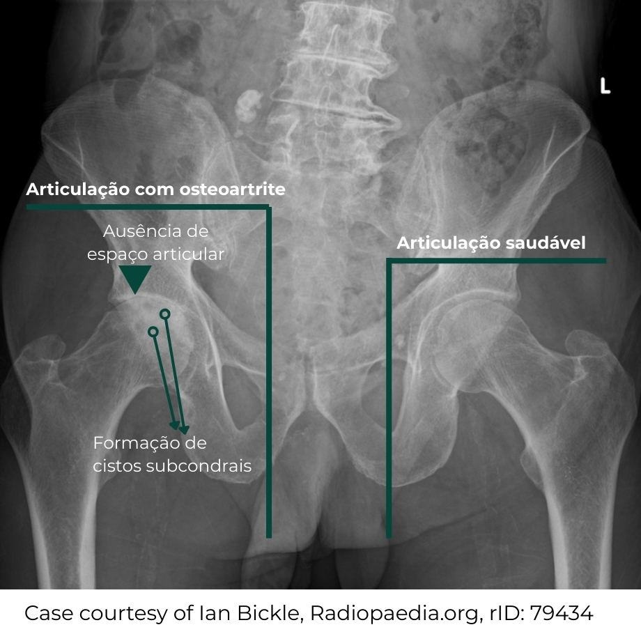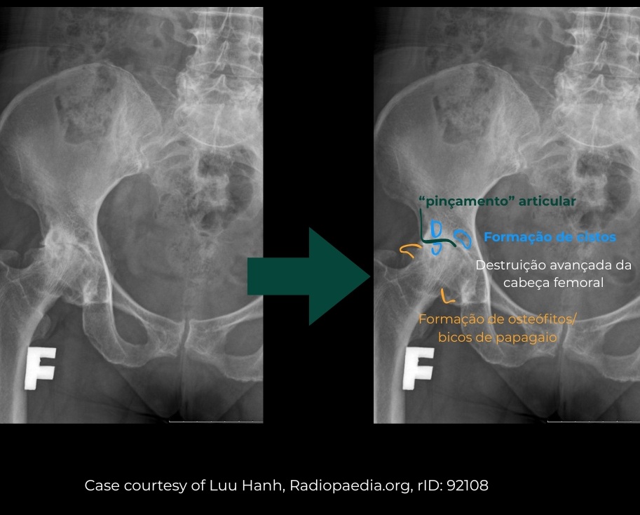 Radiografia do quadril com achados típicos de osteoartrite: Ao lado direito observa-se redução do espaço articular, esclerose óssea, formação de osteófitos e alterações no contorno da cabeça do fêmur e do acetábulo, compatíveis com desgaste da articulação.