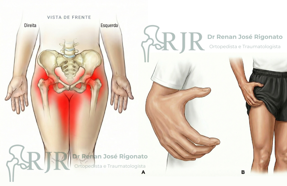 Dor da artrose / desgaste do quadril: geralmente localizada na virilha, com padrão articular, podendo irradiar para a coxa, nádegas ou joelho. É comum o paciente apontar a dor com o sinal do “C”, colocando a mão sobre a face anterior e lateral do quadril, especialmente após esforço ou ao iniciar os movimentos.