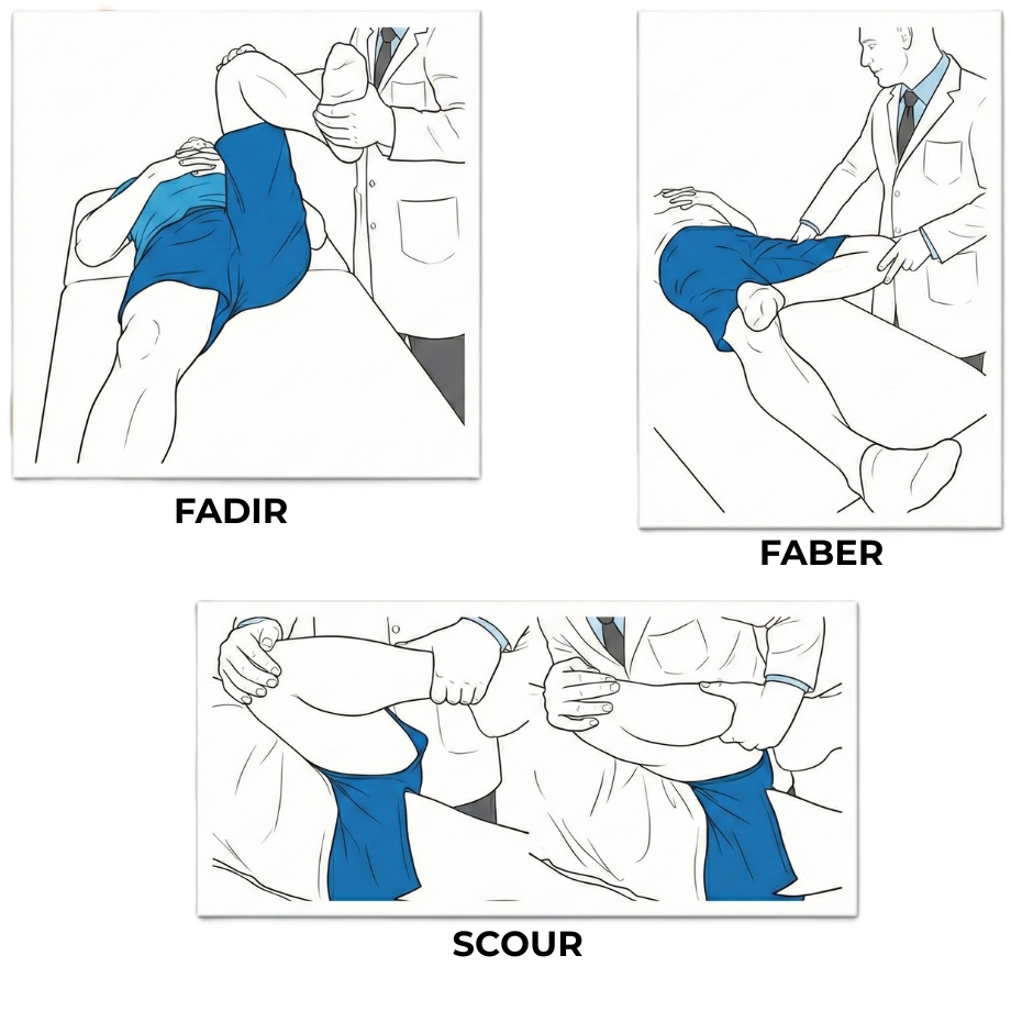 Testes clínicos do quadril (FADIR, FABER e SCOUR): Manobras específicas utilizadas no exame físico do quadril para avaliar se a dor tem origem articular, auxiliando na diferenciação entre dor do quadril e dor proveniente de outras estruturas, como musculatura ou coluna.