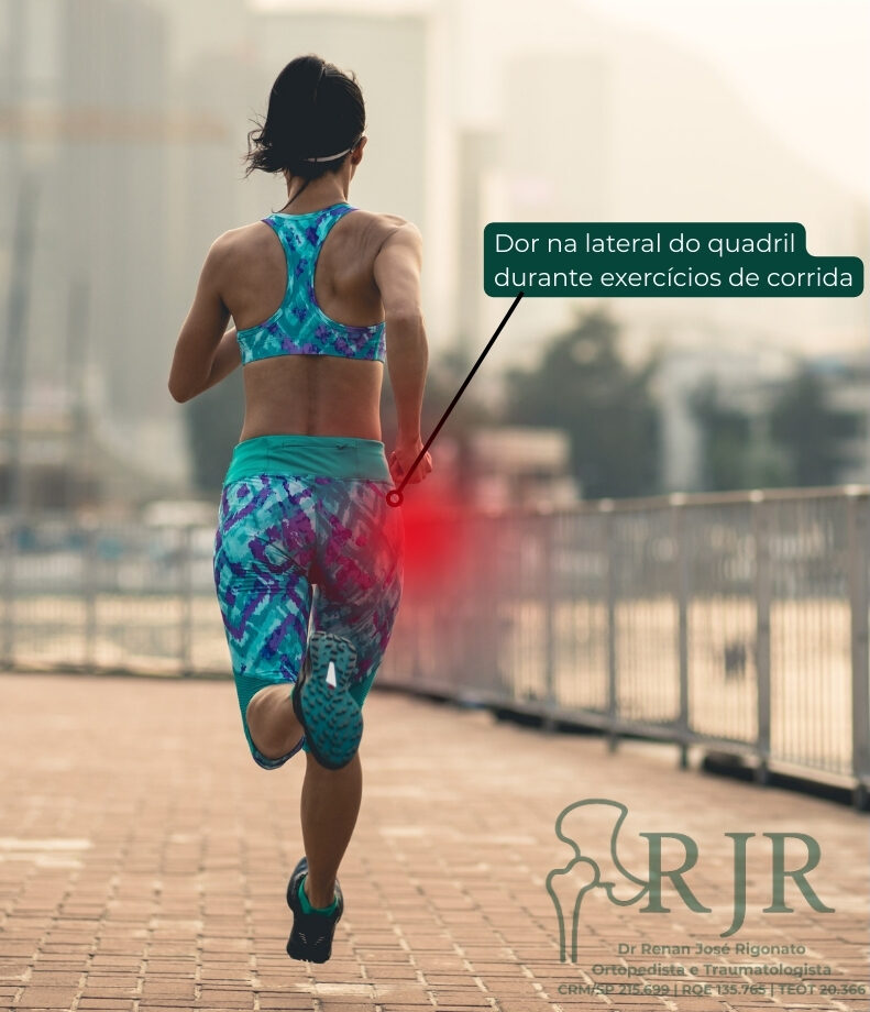 Sintoma da Síndrome Dolorosa do Grande Trocânter: Dor na lateral durante a corrida, quando o quadril dolorida está apoiado.