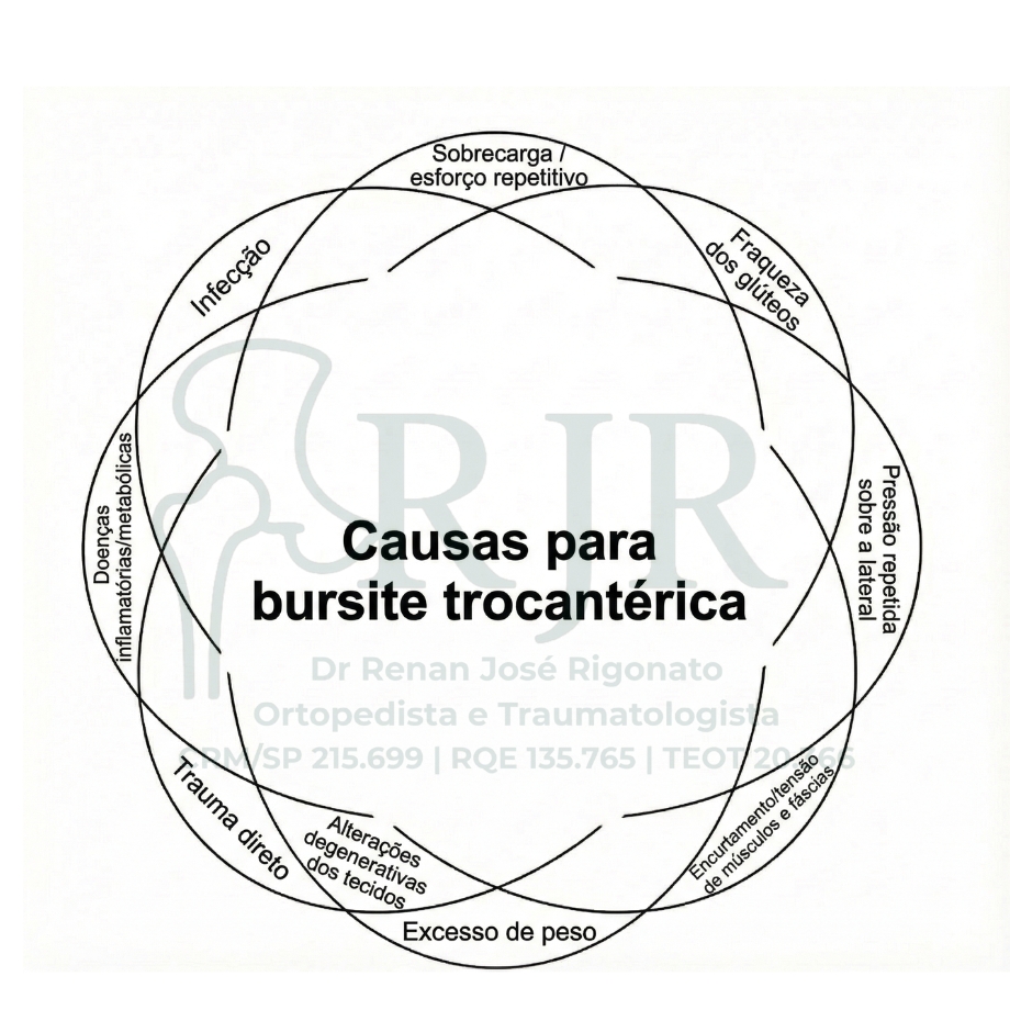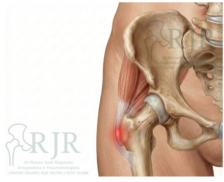 Hoje, o conceito mais correto e usado é a Síndrome Dolorosa do Grande Trocânter, que engloba um conjunto de causas na mesma região: pode haver bursite, mas é muito comum existir também irritação ou degeneração dos tendões dos glúteos (glúteo médio e mínimo), além de sobrecarga mecânica local. Por isso, o diagnóstico depende da história e do exame físico, e o tratamento costuma focar em ajuste de carga e fortalecimento do quadril, e não apenas em “anti-inflamatório para a bursa”.