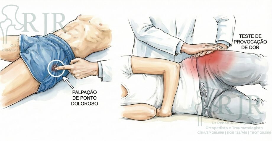 A dor na lateral do quadril costuma ter um padrão bem típico: ela piora com a palpação profunda na região do trocânter maior, onde fica a bursa trocantérica. Além disso, durante o exame, é comum a dor aumentar quando o paciente está deitado sobre o lado não doloroso e tenta abrir a perna (abdução) contra a resistência do médico, porque essa manobra sobrecarrega a região lateral do quadril.