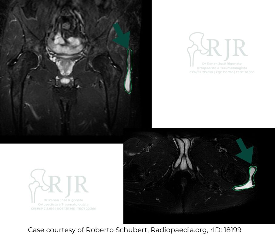 Na ressonância magnética (RM) do quadril, a bursite trocantérica costuma aparecer como líquido e distensão da bursa ao redor do grande trocânter, geralmente com sinais de inflamação local (edema nas partes moles). Com frequência, a RM também mostra achados associados da síndrome dolorosa do grande trocânter, como tendinopatia do glúteo médio e/ou mínimo e, em alguns casos, rupturas parciais desses tendões.