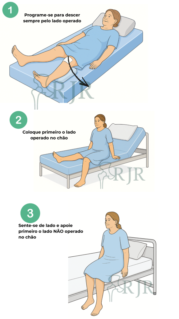 Ao sair da cama, o ideal é descer pelo lado operado, pois isso facilita o movimento e reduz o risco de torcer o quadril.
