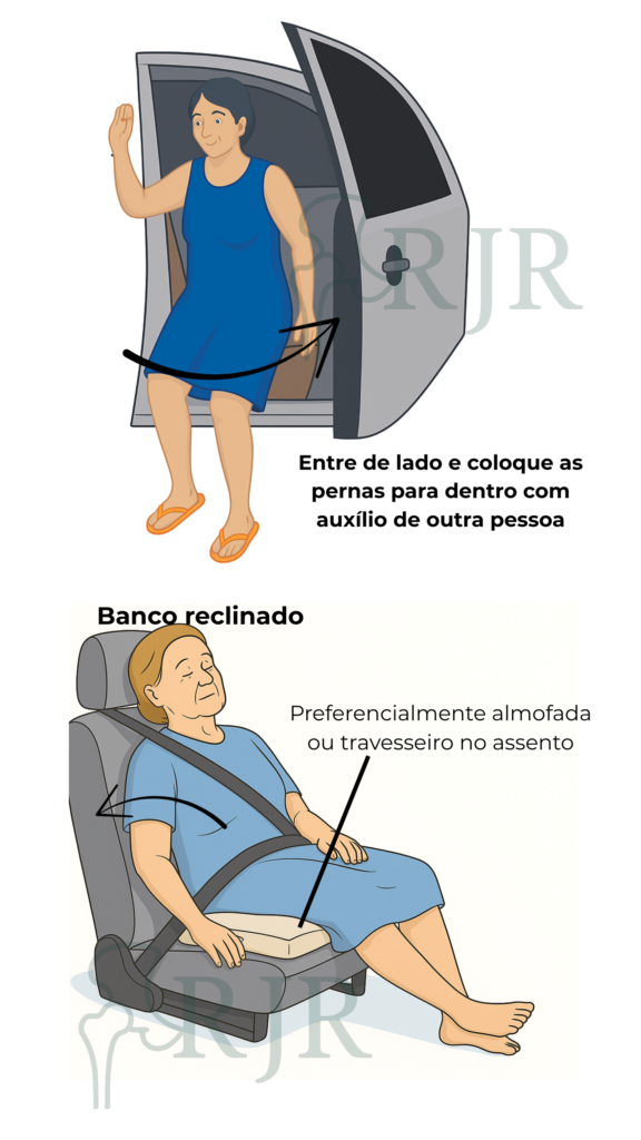 O ideal é sentar-se no banco do carona dianteiro, que deve estar recuado ao máximo e com o encosto levemente reclinado. Isso facilita o movimento de entrar e sair do veículo sem forçar o quadril.